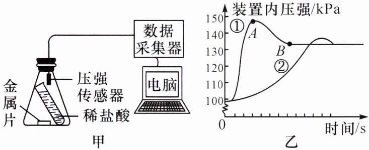 13. 新考向 数字化实验 小明同学在探究金属与酸的反应时,将足量镁片、铝片(均已去除氧化膜)分别与等浓度、等质量的稀盐酸反应(装置如图甲),用压强传感器测得装置内压强随时间的变化关系如图乙。下列说法错误的是(