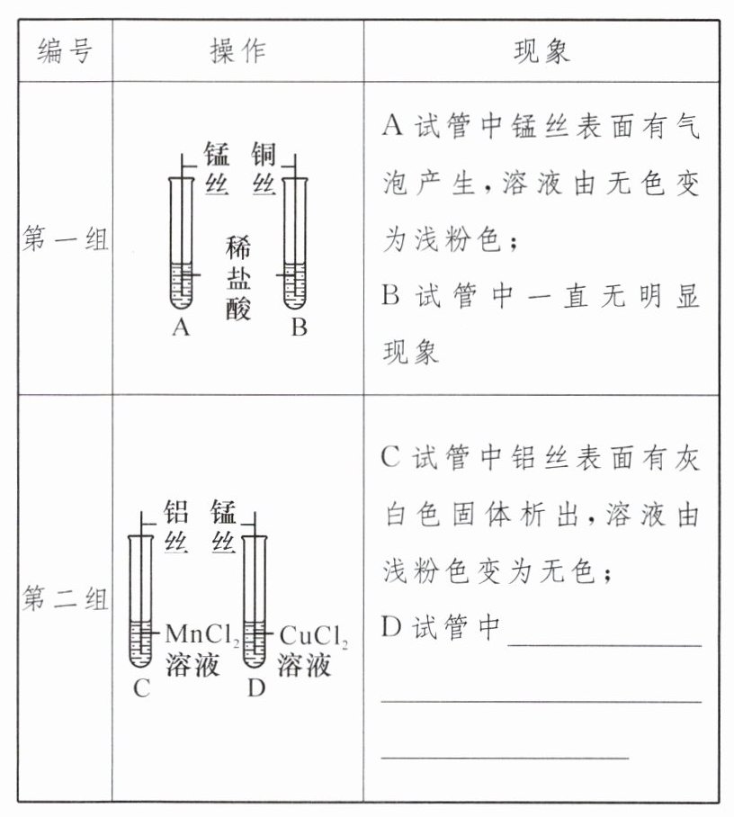 2. [科学探究与实践]铝铜锰合金具有密度低、强度高、硬度高、加工性能好、耐高温等特点。因此,它是首选的轻量化结构材料之一,已广泛应用于航空航天、交通运输等各个领域。某化学兴趣小组的同学们想探究金属锰与铝、铜在金属活动性顺序表中的位置,展开如下探究。