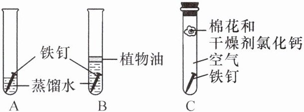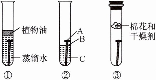 。②一周后,观察 A、B、C 中的铁钉,只有 A 中的铁钉出现了明显锈蚀现象,由此得出铁钉锈蚀需要与