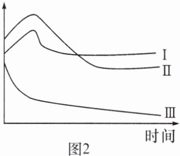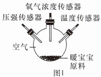 4. 暖宝宝中有铁粉等物质,遇氧气温度升高。小红用压强、氧气浓度和温度三种数字传感器画出暖宝宝原料遇空气的数据变化图像,如图 2,下列说法中不正确的是( )