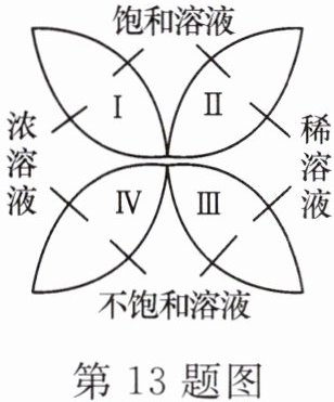 13. 化学中有许多概念是相对的,又是统一的。如图反映了饱和溶液、不饱和溶液、浓溶液以及稀溶液的关系。