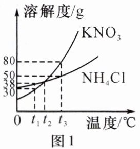 (2)如图 1 为$KNO_{3}$和$NH_{4}Cl$的溶解度曲线。$t_{3}^{\circ}C$时将等质量的$KNO_{3}$、$NH_{4}Cl$两种物质的饱和溶液分别降温到$t_{2}^{\circ}C$,所得溶液中的溶质质量大小关系为$KNO_{3}$
