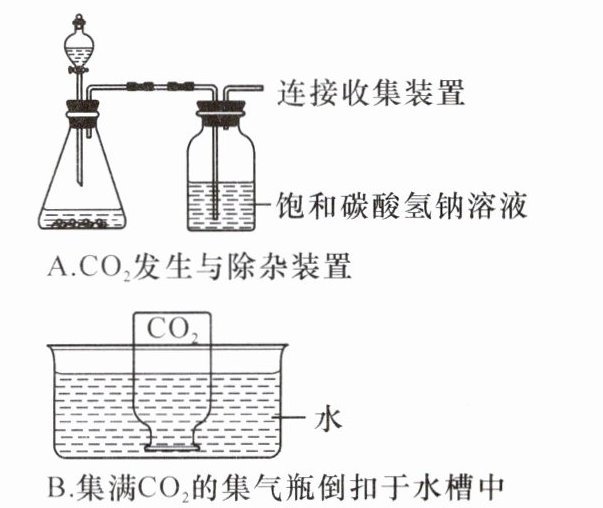 小组同学分别用向上排空气法和排水法各收集2瓶${CO_{2}}$(发生与除杂装置见图A),重复图B实验,在不同时间测得集气瓶中进入的水量占集气瓶容积的百分数数据见下表。(已知:饱和碳酸氢钠溶液可除去${CO_{2}}$中混有的少量${HCl}$气体,${CO_{2}}$在饱和碳酸氢钠溶液中的溶解能力很弱)