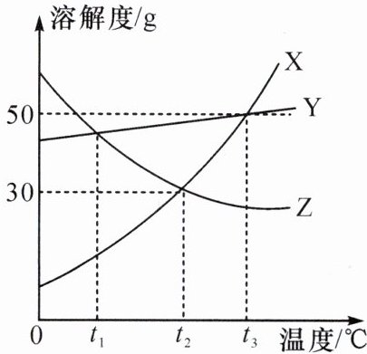 D.分别将$t_2℃$时的$X$、$Y$、$Z$三种物质的饱和溶液降温至$t_1℃$,所得溶液中溶质质量分数的大小关系为:$Y>Z>X$