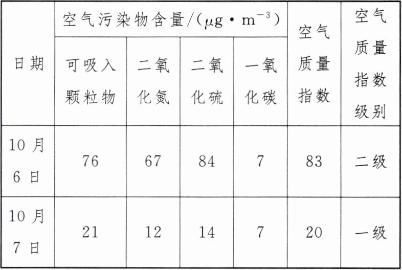 。(3)已知 10 月 6 日晚下了一夜雨,比较这两天的空气质量日报,发现含量没有变化的物质是一氧化碳,据此猜测一氧化碳具有的物理性质是