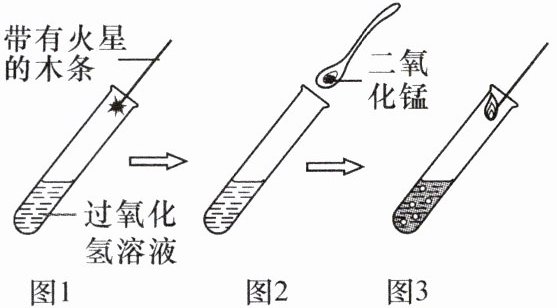 (1) 实验方法:①向图 1 试管中加入 5 mL 5%的过氧化氢溶液,把带有火星的木条伸入试管中,观察现象。②向图 2 试管中加入少量二氧化锰,把带有火星的木条伸入试管中,观察现象。③待试管中没有现象发生时,重复进行①的实验操作,观察现象。