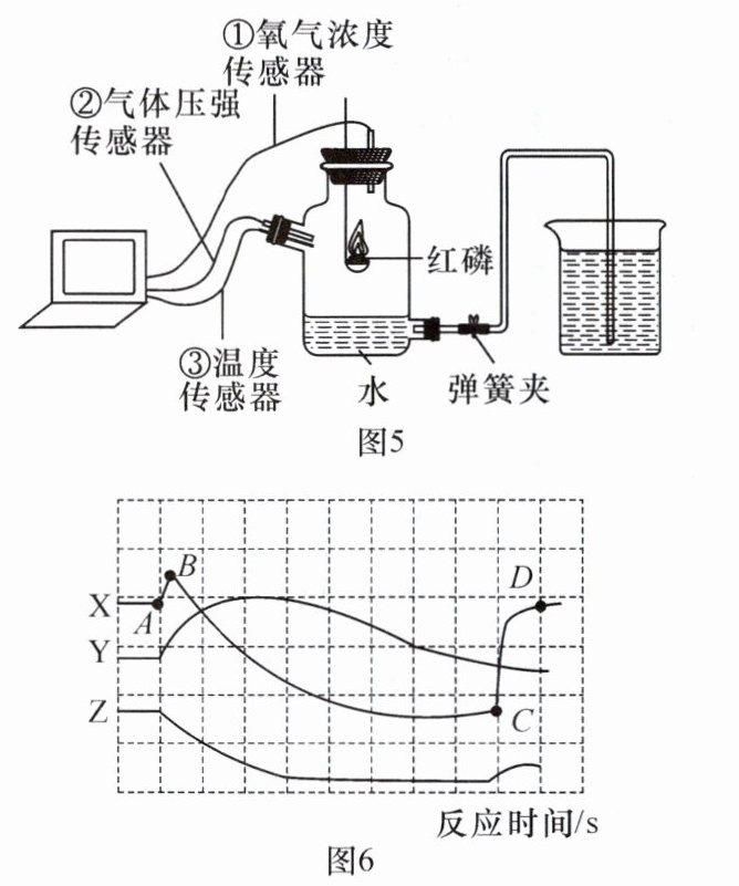 图 5 是利用传感器测定装置内各物理量的实验装置,图 6 是传感器测定的实验中温度、氧气浓度和压强随反应时间变化的曲线。