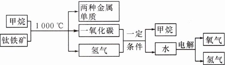 11. 科学思维分析判断近年来我国航天事业发展迅速,对月球进行了多次科学探测,发现月球贮存有一定数量甲烷($CH_{4}$)和钛铁矿(主要成分$FeTiO_{3}$)。人类有望利用月球上的资源,并通过一系列反应获取氢气为火箭提供燃料,获取氧气逐渐形成可供呼吸的大气层。如图是科学家设想的有关人类利用月球资源的操作流程。