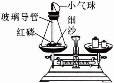 实验方法:如图所示,称量反应前装有红磷的锥形瓶和玻璃导管的总质量$m_{1}$,取下锥形瓶,将玻璃导管下端在酒精灯火焰上灼烧至红热,迅速用橡胶塞将锥形瓶塞紧,引燃红磷。待锥形瓶冷却后,重新放到托盘上称量,称得总质量$m_{2}$。