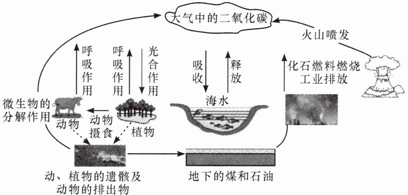 5. 利用图示方式说明二氧化碳的排放与吸收途径。