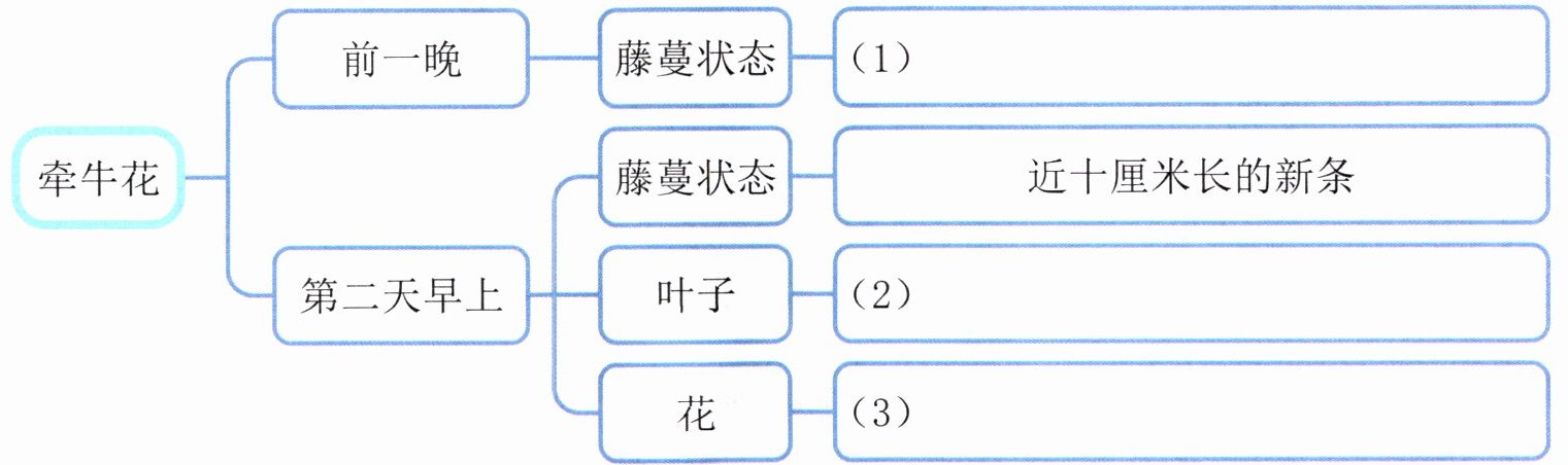 1. 思维导图 第⑥自然段描写了牵牛花攀爬生长的过程,请结合第⑥自然段完成下面的思维导图。(3分)
