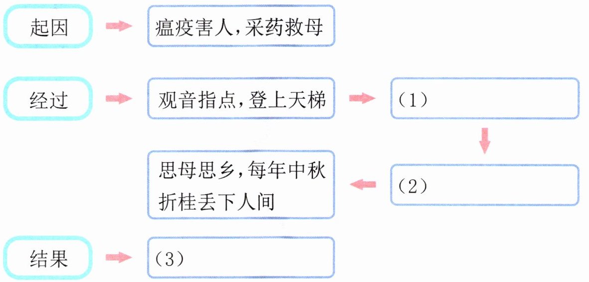 1.(1)为救母亲与乡亲,摇尽桂花 (2)玉帝惩罚吴刚去砍倒桂树 (3)咸宁再也没有了灾难(每空 2 分) 解析:本题考查概括段落大意的能力。结合思维导图,