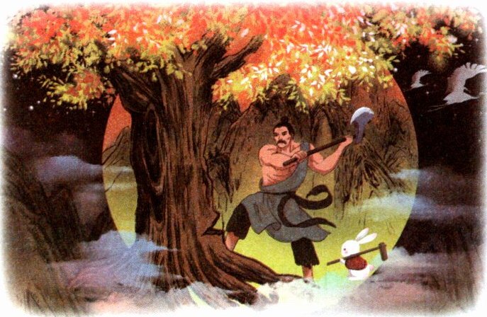 ⑤ 吴刚把事情的前因后果一五一十地对玉帝说了。玉帝听完打心眼儿里喜欢这个年轻人,问吴刚有什么要求。吴刚说他想把桂树带到人间去救苦救难。可吴刚毕竟犯了天规,若不惩罚就不能树立天威。玉帝想了一个主意,只要吴刚能把桂树砍倒,就可以拿走它。这样玉帝既惩罚了吴刚,又答应了吴刚的要求。