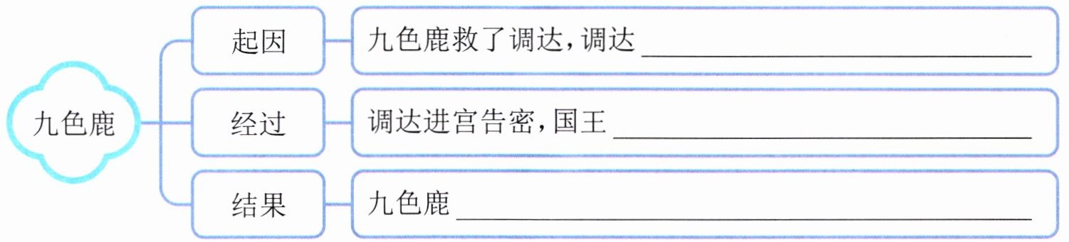 3 表示感谢并发誓决不会说出九色鹿的住处 调集军队跟随调达去九色鹿的住地 揭穿调达,国王严惩了调达(每空 1 分) 解析:本题考查对文章内容的概括能力。首先阅读文章,将文章按照起因、经过、结果划分好层次:文章第①—⑤自然段写了九色鹿救了调达,调达表示感谢并发誓决不会泄露九色鹿的住处,交代了事情的起因;第⑥⑦自然段写了调达出卖九色鹿,交代了事情的经过;第⑧⑨自然段写了九色鹿揭穿了调达的真面目,国王严惩调达,交代了事情的结果。接着用简洁的语言概括出每部分的主要内容即可。