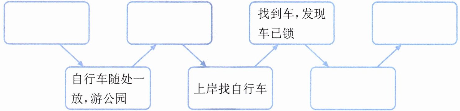 2. 租车游古城 坐游船,想起自行车没上锁 发现车上有纸鹤 发现纸鹤中有车钥匙(每空 1 分)解析:本题考查梳理故事情节的能力。第①自然段就介绍了故事的起因:租车游古城。第②自然段写了“自行车随处一放,游公园”的情节。第③自然段写了作者坐游船突然想起自己的自行车忘记上锁了。第④自然段写了作者上岸找到自行车后发现车已上锁,接着发现车上有纸鹤、纸鹤中有钥匙的事情。