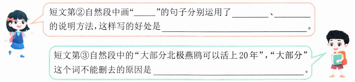 3 列数字 作比较 突出了北极燕鸥迁徙路途之长,之艰难 不是所有北极燕鸥都能活上 20 年,“大部分”一词体现了说明文语言的准确性和严密性(每空 1 分)解析:本题考查对说明方法及其作用的掌握。由“4 万多千米”可以看出运用了列数字的说明方法;将北极燕鸥和飞机在两极之间往返进行对比,运用了作比较的说明方法。运用这两种说明方法都是为了突出北极燕鸥迁徙路程之长,之艰难。“大部分”是指超过一半的部分,去掉以后让人觉得所有北极燕鸥都可以活上 20年,与事实不符,故不能删去。