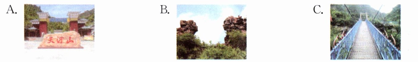 3. 小泉游览了天河山,想发个朋友圈,文案是“巍巍群山层叠峰,牛郎织女遥相对”。下列图片中,与文案最匹配的一项是( )。(2分)