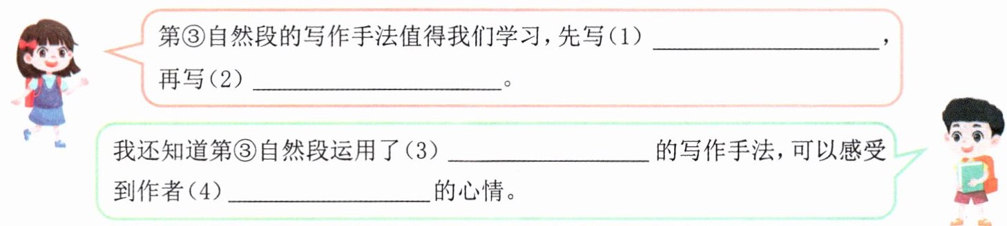 4. 情境化命题下面是两位同学针对第③自然段的写作手法展开的讨论,请帮他们把对话补充完整。(4分)