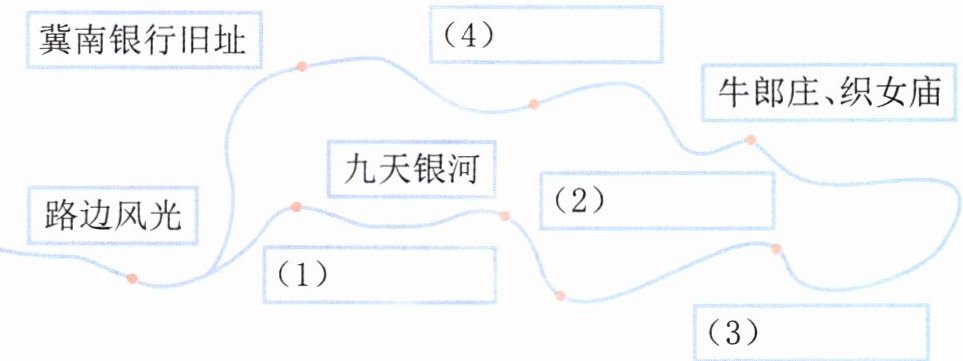 1. 思维导图根据短文内容,把天河山的景点路线图补充完整。(4分)