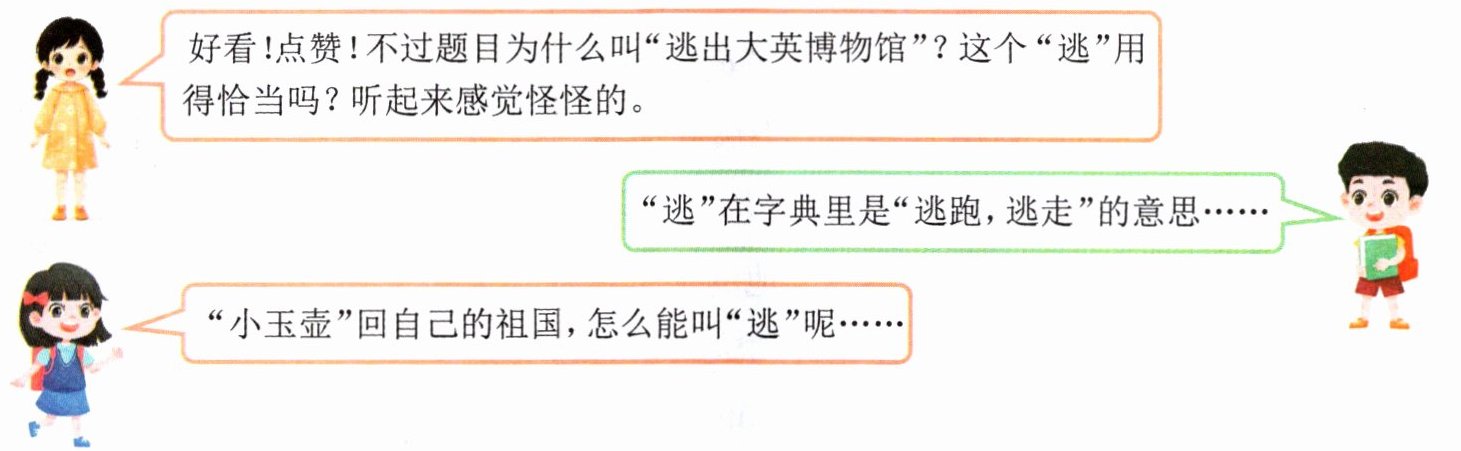 (1)对“逃出大英博物馆”中的“逃”字,大家有不同的看法。你赞成哪种说法?请说明理由。(2分)
