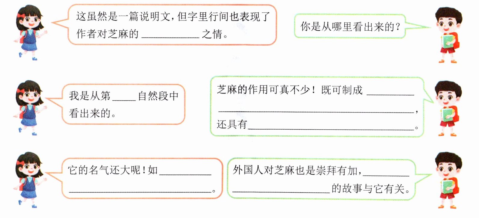 5 喜爱 ⑤ 用途广泛的调味品 较高的药用价值和食疗价值 与“芝麻”有关的典故、歇后语、俗语比比皆是 阿里巴巴与四十大盗(每空 0.5 分)解析:本题考查体会作者感情和信息搜索与筛查的能力。芝麻虽小,作用却大,还与文化有关,可见作者是多么喜爱它,亲切地称它为“小不点”,结尾点题,作者的感情也流露了出来。第②自然段提到了芝麻油是用途广泛的调味品。第④自然段主要讲了芝麻具有较高的药用价值和食疗价值。第③自然段提到了芝麻在中国和外国名气都很大,与其有关的典故、歇后语、俗语比比皆是,阿里巴巴与四十大盗的故事也与它有关,“芝麻开门”成了打开宝藏大门的暗号。
