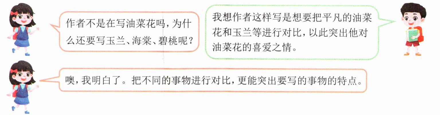 2 示例:如果说有些花天生只可欣赏的话,那么油菜花则天生就是和日常生活联系在一起的,它沾满了生活的烟火气。(2分) 妙处:把只可欣赏的花与有很强实用价值的油菜花进行对比,突出了油菜花拥有生活的烟火气,与人们的生活联系紧密的特点。(2分) 解析:本题考查获取相关信息的能力和鉴赏能力。根据题干中的对话可知“对比”的含义和作用,很容易找到句子。回答妙处即是作用,抓住关键句“那么油菜花则天生就是和日常生活联系在一起的,它沾满了生活的烟火气”,作用可以概括为“突出了油菜花拥有生活的烟火气,与人们的生活联系紧密的特点”。