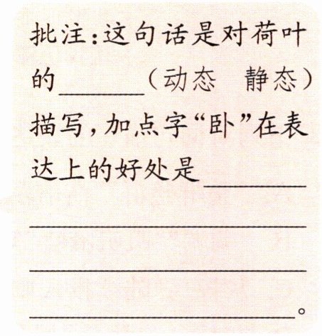 批注:这句话是对荷叶的____(动态 静态)描写,加点字“卧”在表达上的好处是______。