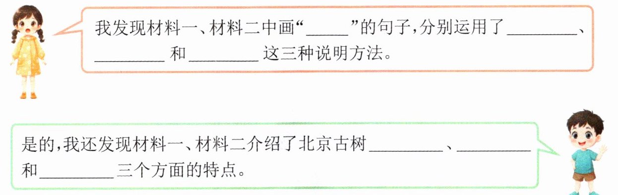 1 列数字 打比方 作比较 数量众多 分布区域广 树种丰富(每空0.5分)解析:本题考查说明方法的辨析与总结文本信息的能力。材料一中“这些古树中树龄在百年以上的有40000多株”,其中“40000”运用了列数字的说明方法。材料二中“它位于画舫斋古柯庭院西南角的假山石上,树的四周堆砌山石,犹如一个巨大的盆景”,将四周堆砌山石的树比喻成一个巨大的盆景,运用了打比方的说明方法。材料二中“这棵古树是北京目前已知树龄最长的古树了,比北京城岁数还要大呢”,将树的年龄和北京城的年龄作对比,运用了作比较的说明方法。所以分析材料中画“ ”的句子可知,分别运用了列数字、打比方和作比较这三种说明方法。由材料一第②自然段中的“北京的古树数量众多。这些古树中树龄在百年以上的有40000多株。在众多古树中树龄在300年以上的一级古树就有6000多株,树龄在100到300年之间的二级古树有34000多株”可知,古树数量众多。由材料一第②自然段中的“北京的古树分布区域很广。不论是在西城区、东城区,还是在海淀区、石景山区、门头沟区等地;不论是在公园,还是在工厂、校园,那一片片成荫的古树都是人们生活中亮丽的风景”可知,古树分布区域广。由材料二中的“北京的古树树种比较丰富。银杏、柏树、元宝枫、黄连木、槐树、枫杨等都是北京古树的常见树种,许多树种中都有名木树木”可知,北京古树树种丰富。