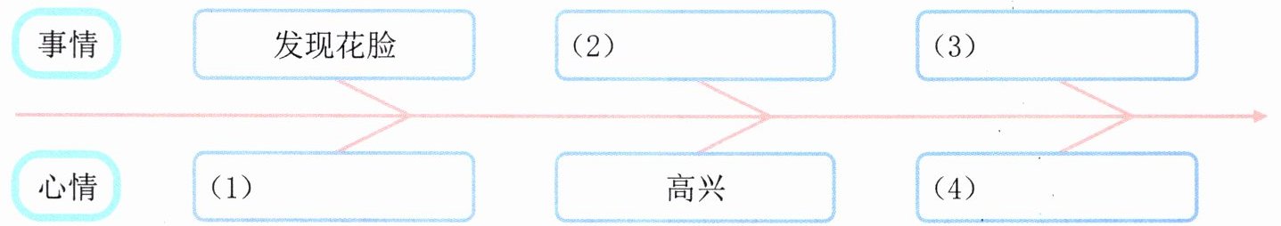 1. 思维导图 短文围绕“我”和花脸写了三部分的内容,表现了“我”不同的心情。请认真阅读全文,完成下面的思维导图。(4分)