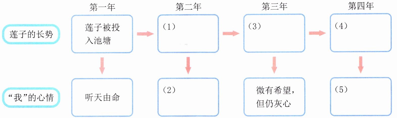 1 种荷 盼荷 赏荷 (1)水面没有露出什么荷叶(2)完全灰了心 (3)长出五六个叶片 (4)绿叶覆盖,荷花亭亭 (5)心中狂喜(每空 1分)解析:本题考查提取关键信息并总结概括的能力。从第①自然段中的“我把五六颗敲破的莲子投入池塘”可得出“种荷”的经历;从第①自然段中的“这样一来,我每天就多了一件工作:到池塘边上去看上几次。心里总是希望,忽然有一天有翠绿的莲叶长出水面”可得出“盼荷”的经历;从第③自然段中的“望着满塘的荷花”可得出“赏荷”的经历。从“我翘盼的水面却仍然没有露出什么荷叶。此时我已经完全灰了心,以为莲子大概不会再有长出的希望了”“而且只长出了五六个叶片。对我来说,这又是虽微有希望但仍令人灰心的一年”“已经全为绿叶所覆盖”“长成了亭亭玉立的荷花”“望着满塘的荷花,我心中狂喜,这几年总算是没有白等”可得出思维导图中应填的答案。