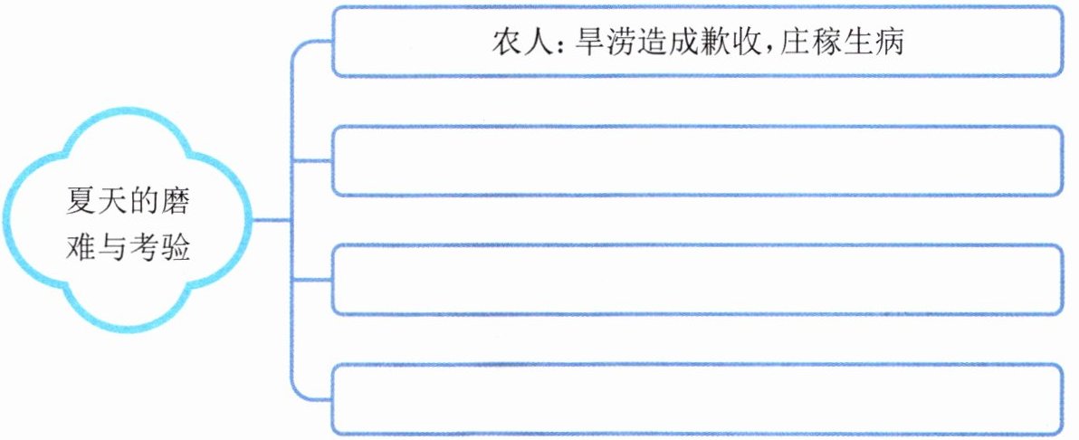 2. 阅读要素 思考短文第②自然段是怎样围绕“夏天的磨难跟考验”这个中心来展开叙写的,并完成下面的思维导图。(3分)