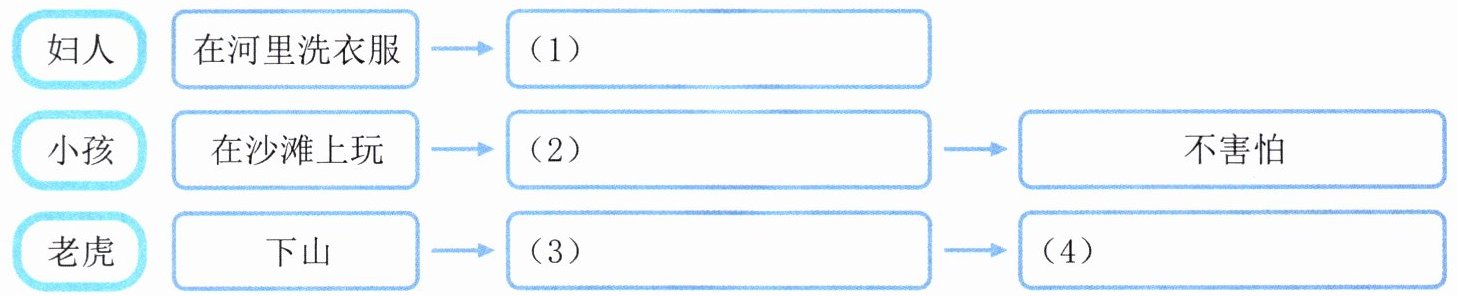 解析:本题考查对文言文内容的理解。结合注释,可知妇人在河里洗衣服,看到老虎的反应是匆忙没入河水中躲避老虎,即“仓皇沉水避之”;小孩在沙滩上玩,看到老虎的反应是依然在沙滩上玩耍,即“戏沙上自若”;老虎从山上下来,仔细看了小孩很久,甚至用头去触碰他们,即“熟视久之,至以首抵触”。老虎希望小孩中有一个能够感到害怕,可是小孩很无知,最终还是不知道害怕。老虎终于离开了,也就是“卒去”。