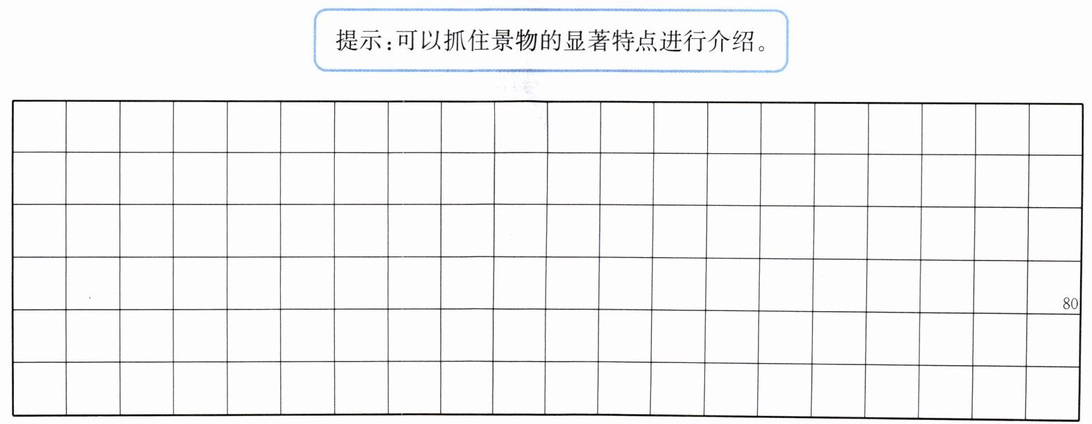 5 示例:抚仙湖位于云南省。抚仙湖储水量极其丰富,湖水清澈、幽深,且湖底还有着一个神秘的古城遗迹。在抚仙湖的幽邃里,你可以自由畅想人类历史由海底游动的生命演化而来的轨迹。(4分) 解析:本题考查语言表达的能力。可以从文中提取关键信息,注意风景介绍词一定要写清楚景物在什么位置,都有什么景观,并能突出景物特点。(评分建议:写出抚仙湖风景的特点,语句通顺、优美得4分。)