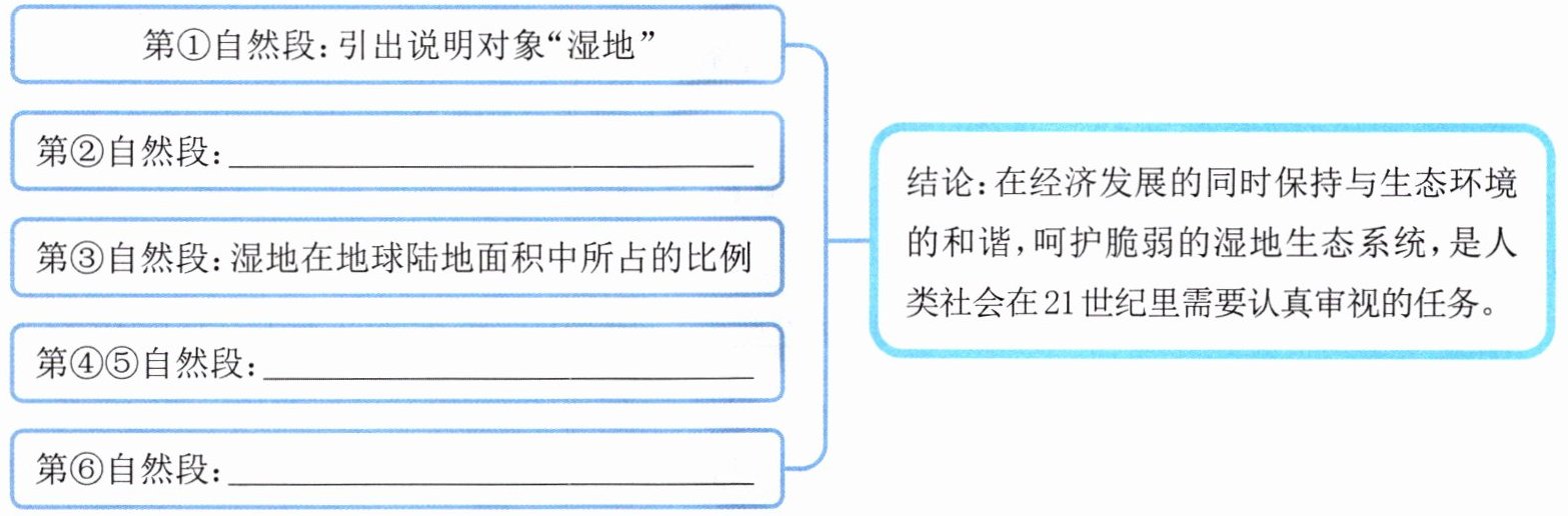 5 示例:学校开设湿地科普课程。(1 分) 政府建立湿地管理与保护机制。(1 分) 解析:本题考查语言表达能力。根据文章第⑥自然段中提到的湿地面临的危机,有针对性地提出两条保护湿地的建议即可。(评分标准:提出两条合理的建议得 2 分,每条 1 分。)