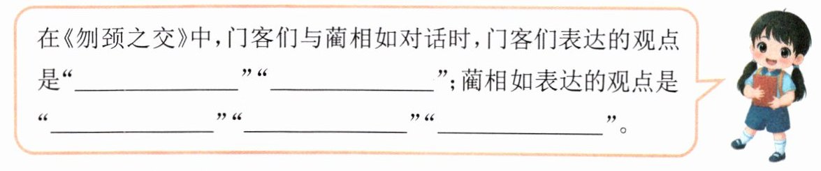 3.完璧归赵(1 分) 渑池之会(1 分) 因为您是个真正崇高的君子,我们才为您做事(1 分) 您对狂妄的廉颇忍气吞声,我们受不了(1 分) 我不怕廉颇(1 分) 秦国不敢来犯赵国,是因为有我和廉颇(1 分) 以江山社稷为重(1 分) 他为了国家不计较私人恩怨(1 分) 通过他们的对话,你觉得蔺相如最值得敬佩的是他为了国家不计较私人恩怨。