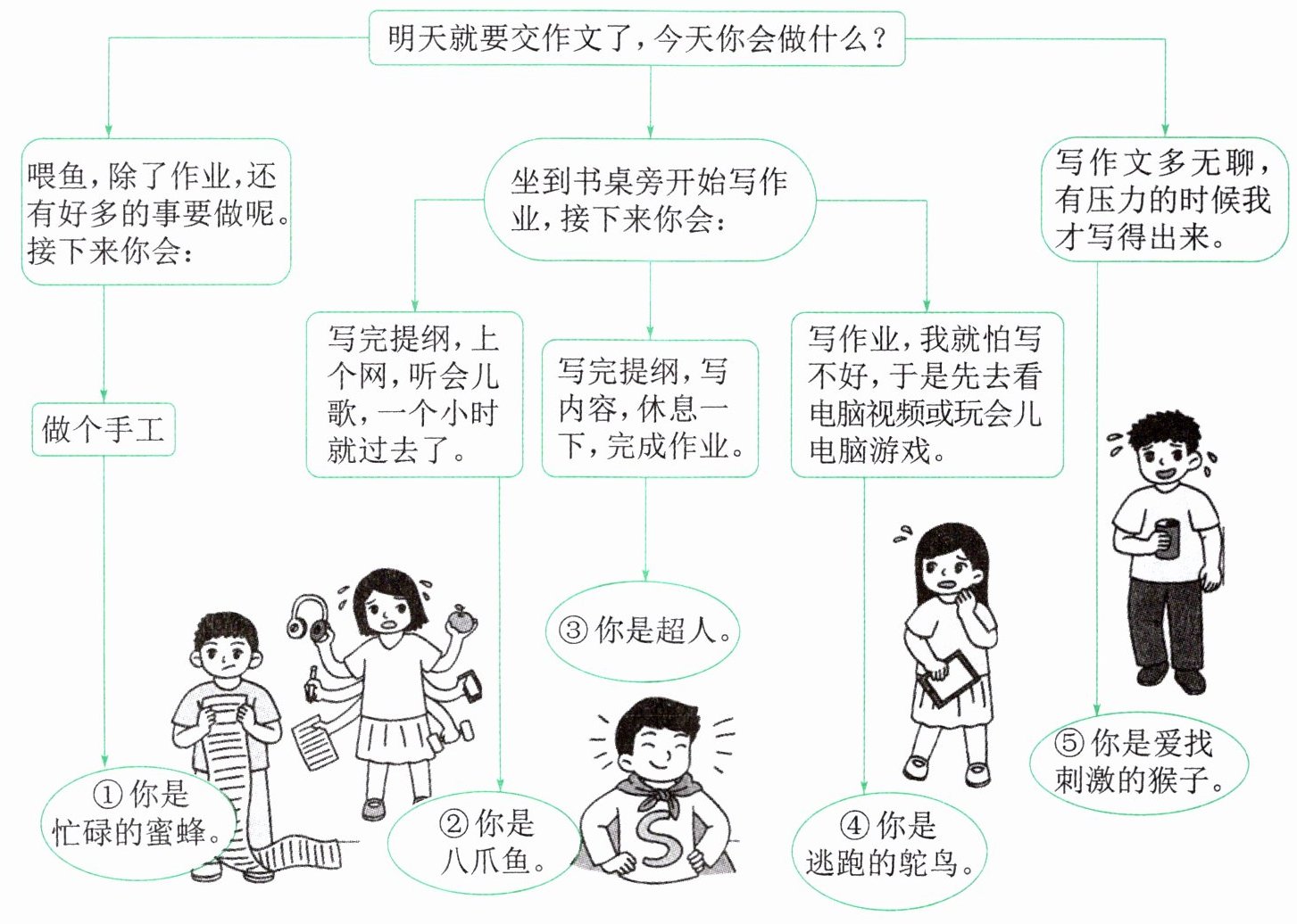 7. 观察材料一,结合全文,为图中"逃跑的鸵鸟"和"爱找刺激的猴子"的拖延找到原因及对策。(4分)