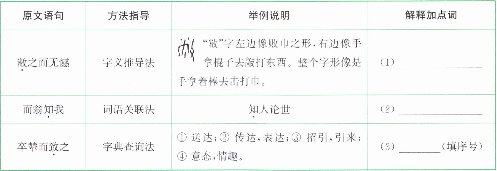 之 | 字典查询法 | ① 送达;② 传达,表达;③ 招引,引来;④ 意志,情趣。 | (3)______(填序号) |2. 用“/”给文中画波浪线的句子断句。(限断2处)