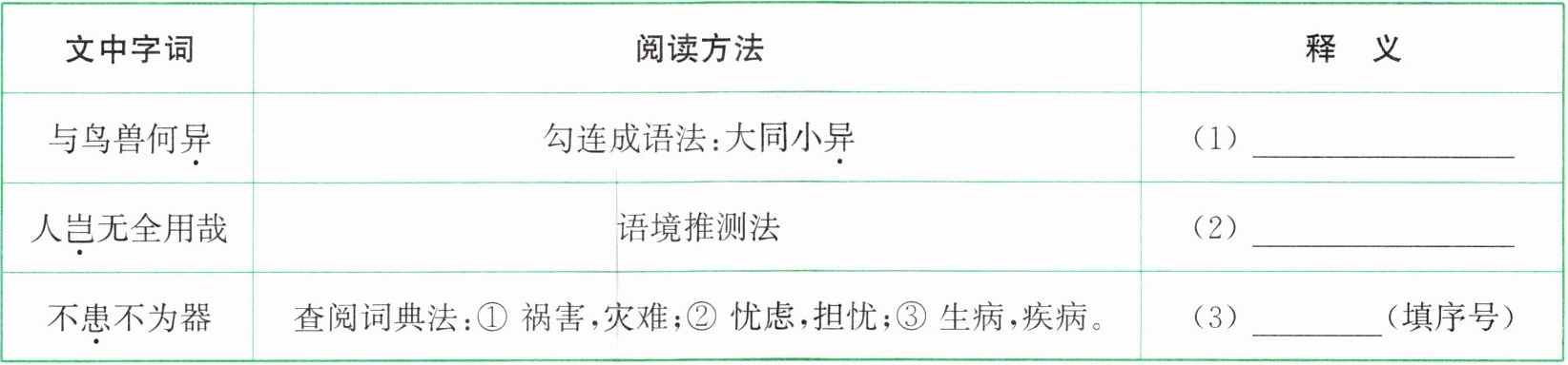 |不患不为器|查阅词典法:① 祸害,灾难;② 忧虑,担忧;③ 生病,疾病。|(3)______(填序号)|