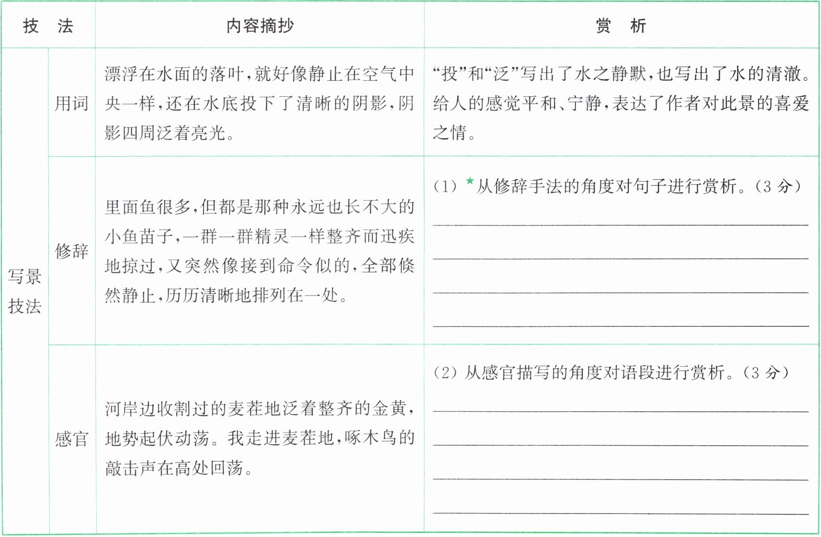 5.(核心素养·思维能力)[景物呈现] 小乐准备搜索图文插画,需要梳理文中景物的特征,请你加以补充。(3分)