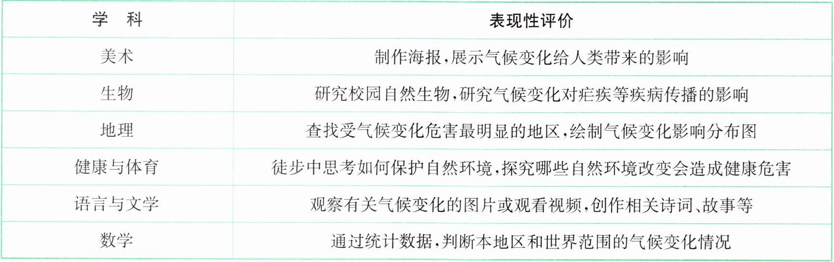 [材料三] 传统上气候教育的重点仅限于气候知识,学习基础科学知识有助于学生加深对气候变化原因和后果的理解。然而,仅学习知识可能不会使学生对待气候问题时的行为和态度发生重大变化。为此,需要反思传统教学方法。而且气候问题复杂,涉及地理、政治等不同维度,但传统有关气候问题的教学和学习仅限于单一学科,因此可以在不同年级和学科领域开展气候变化教育,包括采用体验式、探究式教学方法等。