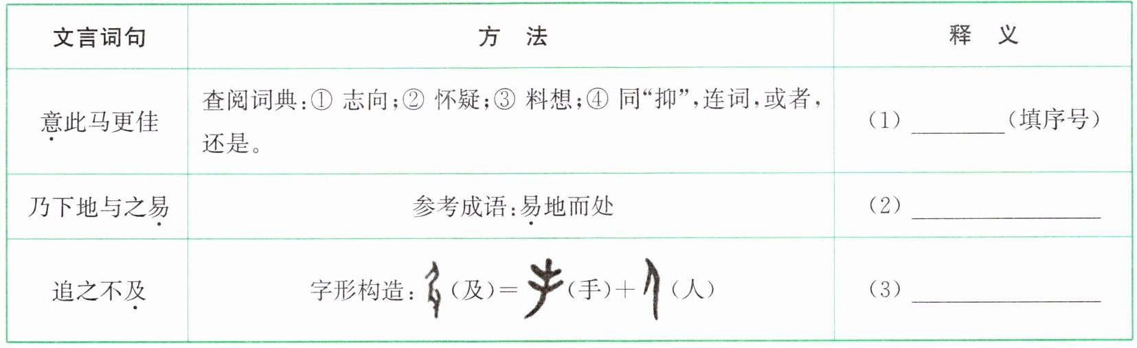 |意此马更佳|查阅词典:① 志向;② 怀疑;③ 料想;④ 同“抑”,连词,或者,还是。|(1)______(填序号)|