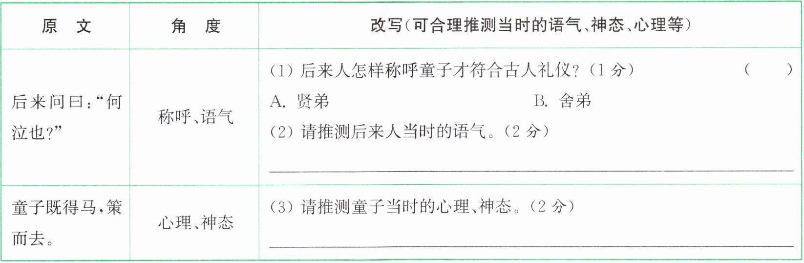 |后来问曰:“何泣也?”|称呼、语气|(1)后来人怎样称呼童子才符合古人礼仪?(1 分)( )A. 贤弟B. 舍弟(2)请推测后来人当时的语气。(2 分)______|