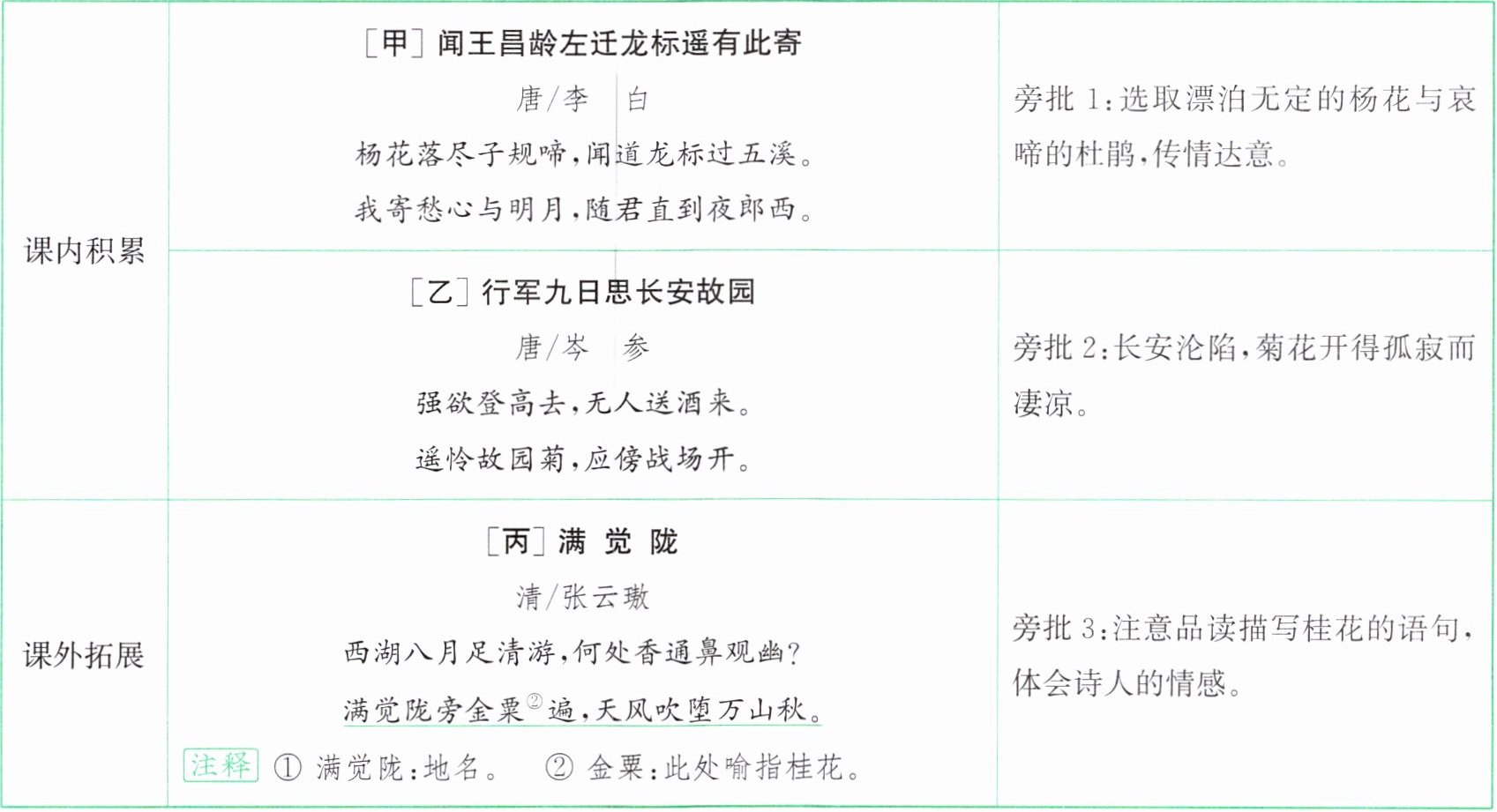 | 课内积累 | [甲]闻王昌龄左迁龙标遥有此寄唐/李白杨花落尽子规啼,闻道龙标过五溪。我寄愁心与明月,随君直到夜郎西。 | 旁批 1:选取漂泊无定的杨花与哀啼的杜鹃,传达情意。 |