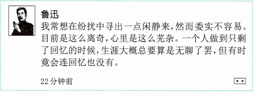 目前是这么离奇,心里是这么芜杂。一个人做到只剩了回忆的时候,生涯大概总要算是无聊了罢,但有时竟会连回忆也没有。