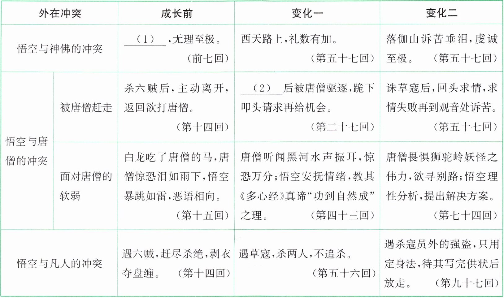 |悟空与神佛的冲突|(1)______,无理至极。(前七回)|西天路上,礼数有加。(第五十七回)|落伽山诉苦垂泪,虔诚至极。(第五十七回)|