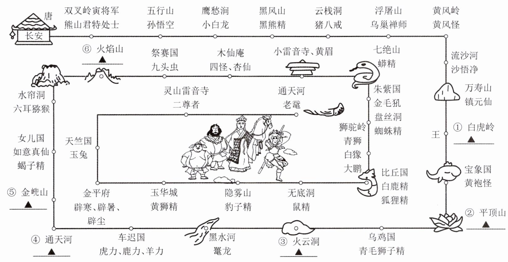 (1) 请从图中标“▲”处任选两处,写出唐僧师徒在此处所遇妖怪。(2 分)______