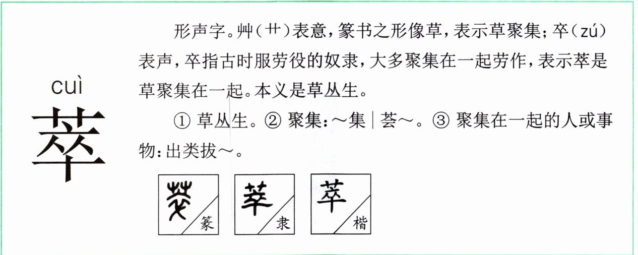 形声字。艸(艹)表意,篆书之形像草,表示草聚集;卒(zú)表声,卒指古时服劳役的奴隶,大多聚集在一起劳作,表示萃是草聚集在一起。本义是草丛生。