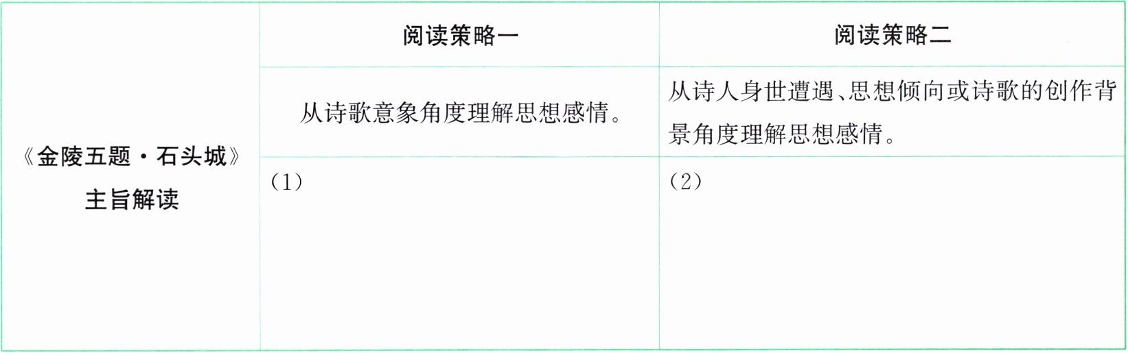 | 《金陵五题·石头城》主旨解读 | (1)从诗歌意象角度理解思想感情。 | (2)从诗人身世遭遇、思想倾向或诗歌的创作背景角度理解思想感情。 |