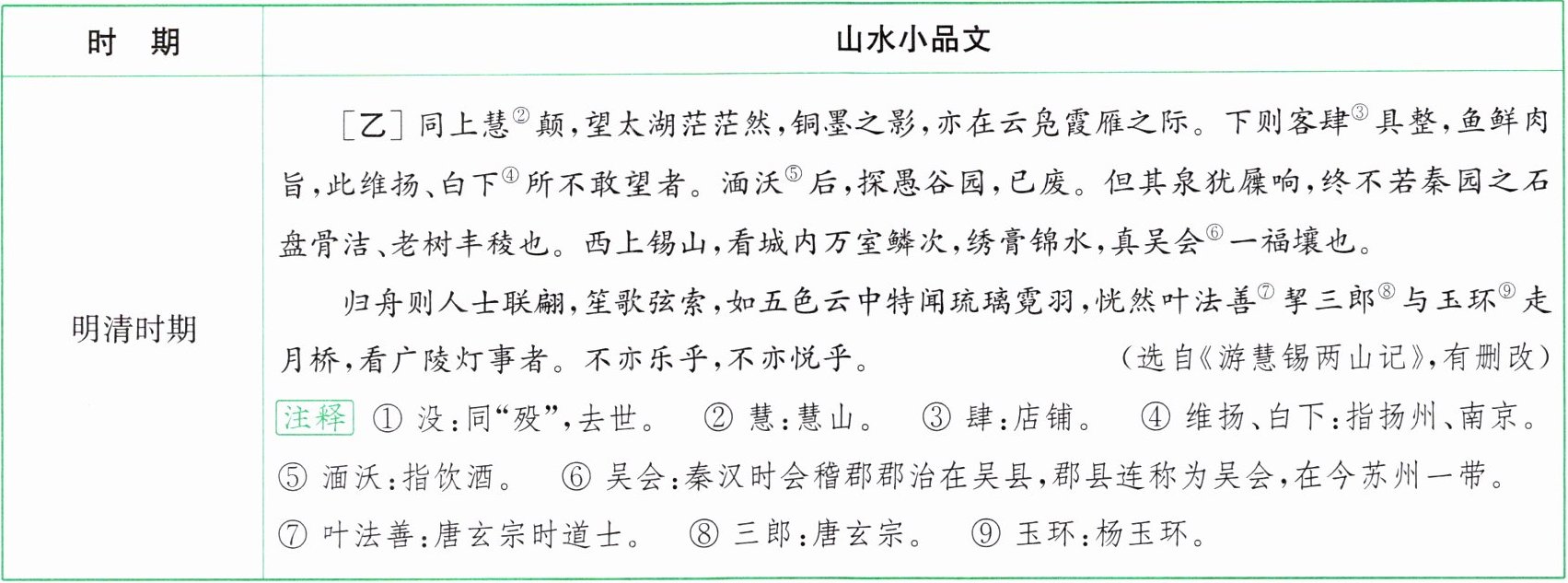 |明清时期|[乙]同上慧②颠,望太湖茫茫然,铜墨之影,亦在云霞雁鹜之际。下则客肆③具整,鱼鲜肉旨,此维扬、白下④所不敢望者。涵沃⑤后,探愚公谷,已废。但其泉犹屧响,终不若秦园之石盘骨洁、老枫干稜也。西上锡山,看城内万室鳞次,绣膏锦水,真吴会⑥一福壤也。归舟则人士联翩,笙歌弦索,如五色云中特闻琉琬霓羽,恍然叶法善⑦挈三郎⑧与玉环⑨走月桥,看广陵灯事者。不亦乐乎,不亦悦乎。(选自《游慧锡两山记》,有删改)注释 ① 没:同“殁”,去世。 ② 慧:慧山。 ③ 肆:店铺。 ④ 维扬、白下:指扬州、南京。 ⑤ 涵沃:指饮酒。 ⑥ 吴会:秦汉时会稽郡治在吴县,郡县连称为吴会,在今苏州一带。 ⑦ 叶法善:唐玄宗时道士。 ⑧ 三郎:唐玄宗。 ⑨ 玉环:杨玉环。|