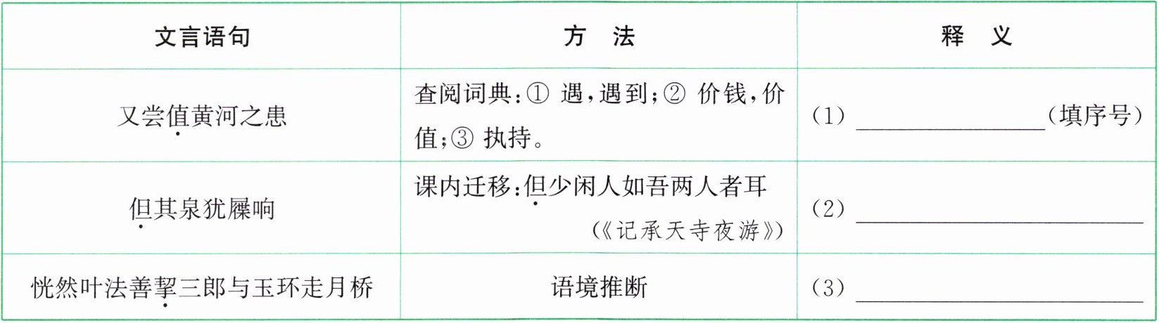 黄河之患|查阅词典:① 遇,遇到;② 价钱,价值;③ 执持。|(1)______(填序号)||